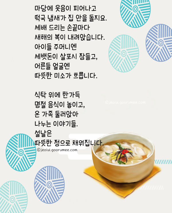 5. 우리는 다양한 색깔과 무늬로 자신의 삶을 기쁨으로 채울 수 있습니다. 산다는 것, 그 자체로 소중한 일입니다. 삶의 어느 부분을 하얗게 지워버렸다 해도, 부모와 자식의 관계만큼은 영원히 남습니다. 삶에서 가장 중요한 가족들을 만나는 설 명절입니다. 소박하면 소박한 대로, 화려하면 화려한 대로 가족들과 행복한 시간을 보내는 설 연휴가 되시길 바랍니다. 새해 복 많이 받으시고, 행복과 즐거움과 희망으로 가득한 2026년 한 해가 되시길 기원합니다.
