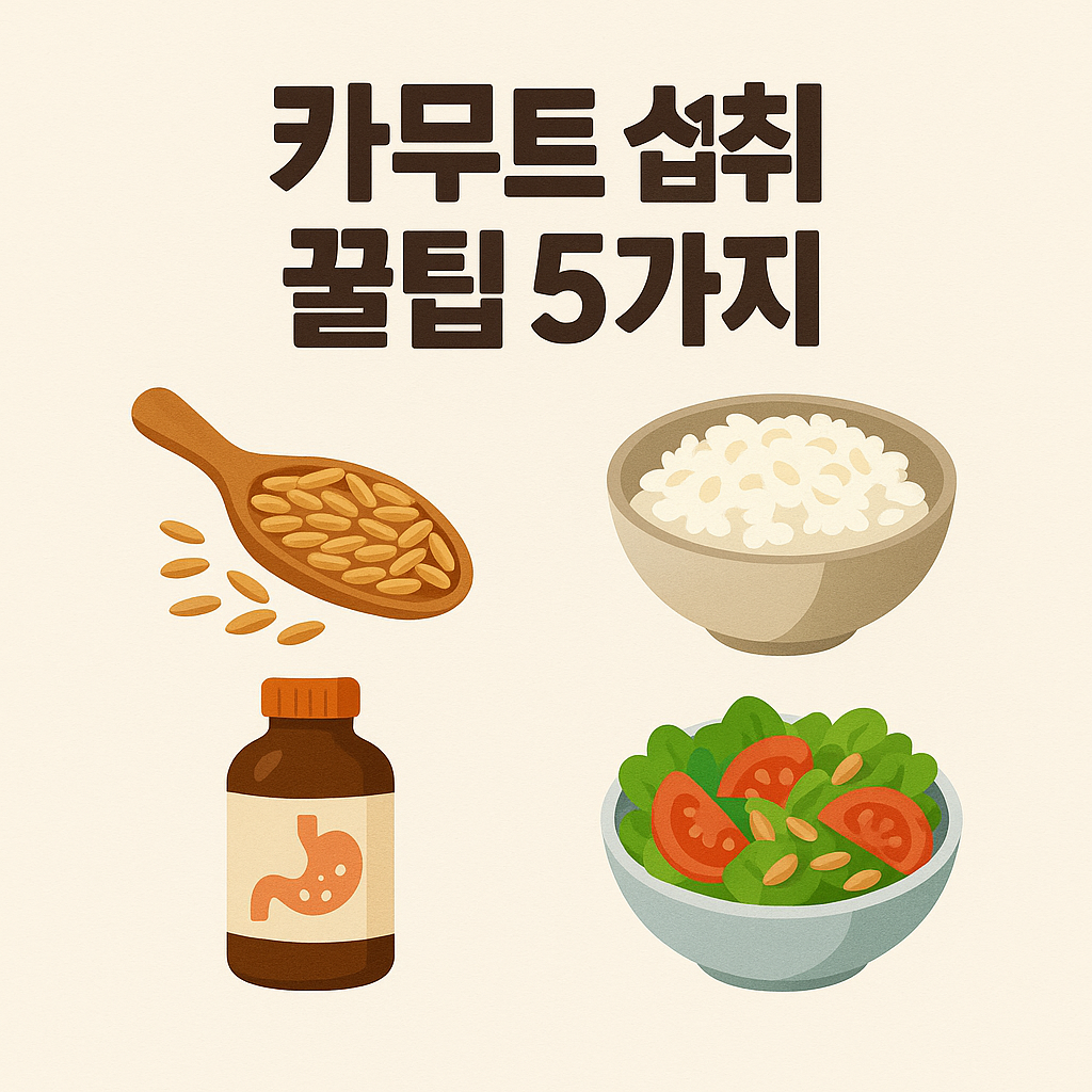 - 카무트 스무디: 삶은 카무트 2스푼 + 바나나 1개 + 두유 200ml + 아몬드 5알을 함께 갈면 포만감 있는 한 끼 대체식으로 좋아요.