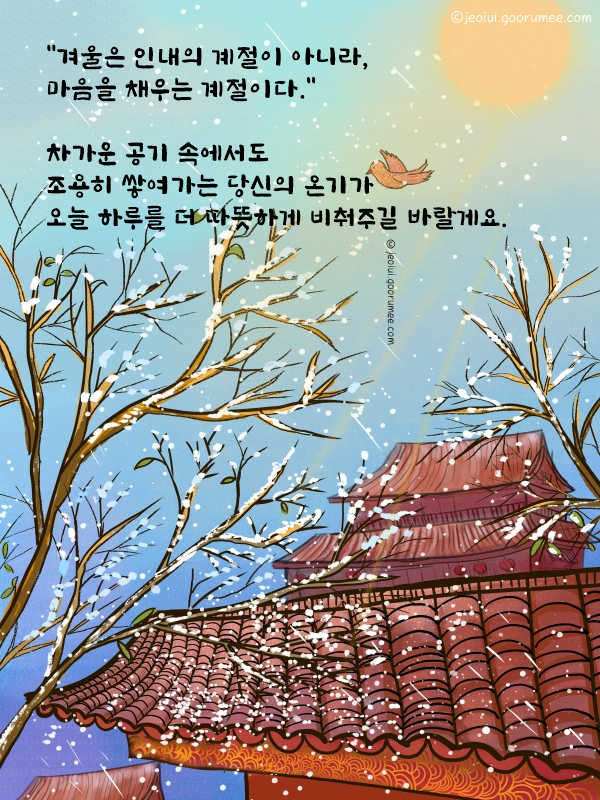 12월도 어느새 중순을 향해 가네요. 마음이 조금 조급해지는 시기지만, 오늘은 숨 한 번 길게 쉬어가셨으면 합니다. 남은 12월은 나를 덜 몰아붙이는 방향으로 흘러가길 바랍니다.